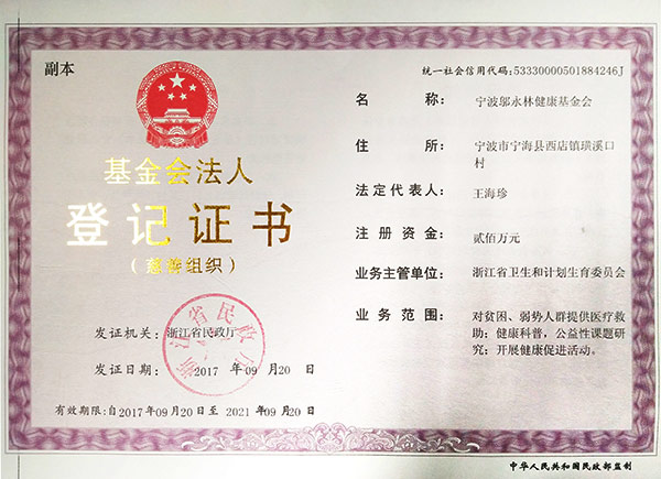 宁波邬永林健康基金会,成立于2010年10月,是在浙江省民政厅注册、由浙江省卫生健康委主管的非公募基金会。基金会的原始基金数额为人民币贰佰万元,来源于爱游戏-中国一站式体育服务官网 。《慈善法》颁布后,本基金会被认定为慈善组织。